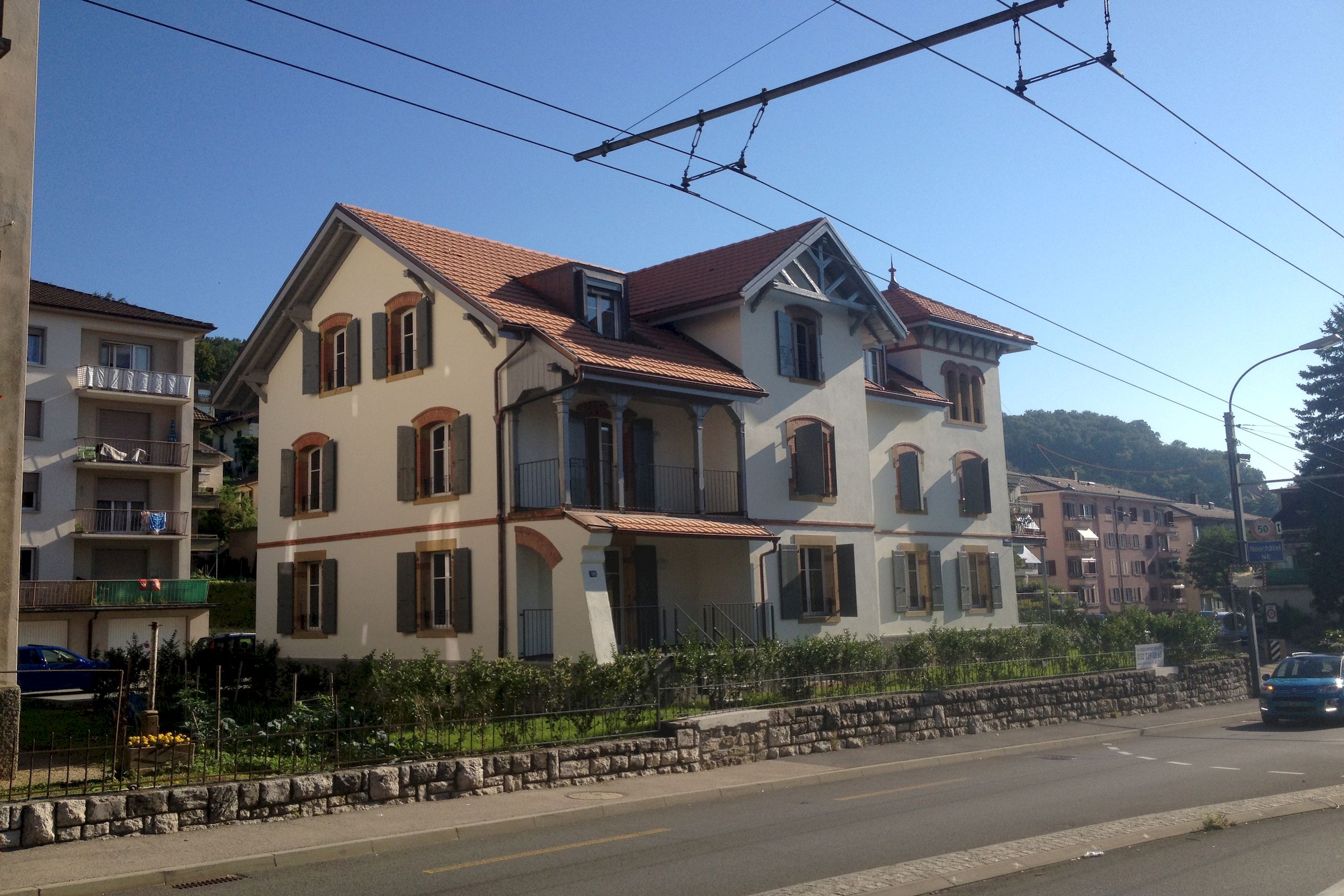 Ce petit immeuble a été construit dans les années 1905 sur une parcelle trapézoïdale située à la frontière entre les communes de Peseux et Neuchâtel.