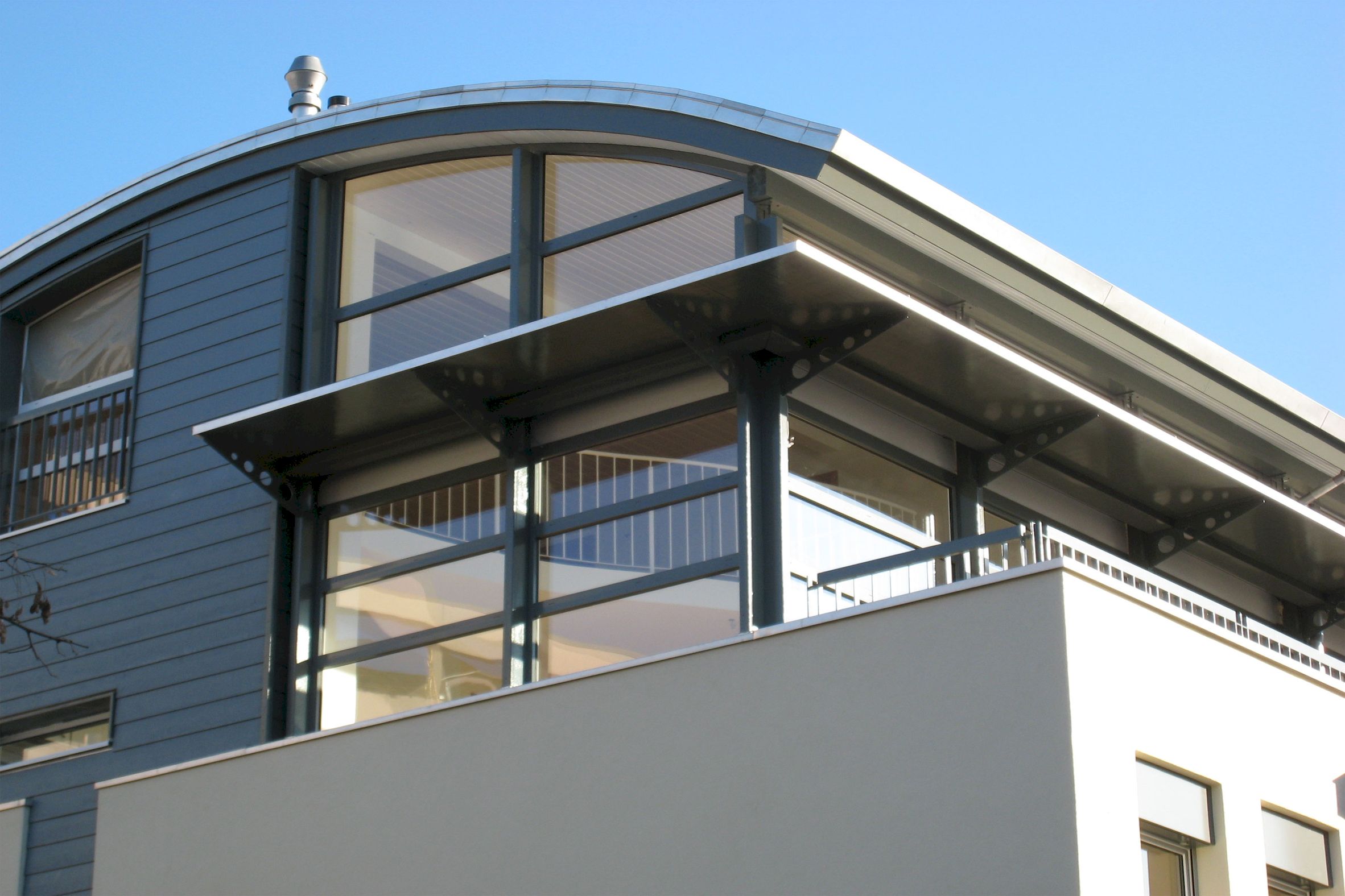 La toiture arquée constituée d’une charpente en bois avec une isolation entre chevrons, d’une sous-couverture traditionnelle supporte une couverture – étanchéité en caoutchouc EPDM à soudure thermique. Cette couverture est d’ailleurs une première en suisse romande.