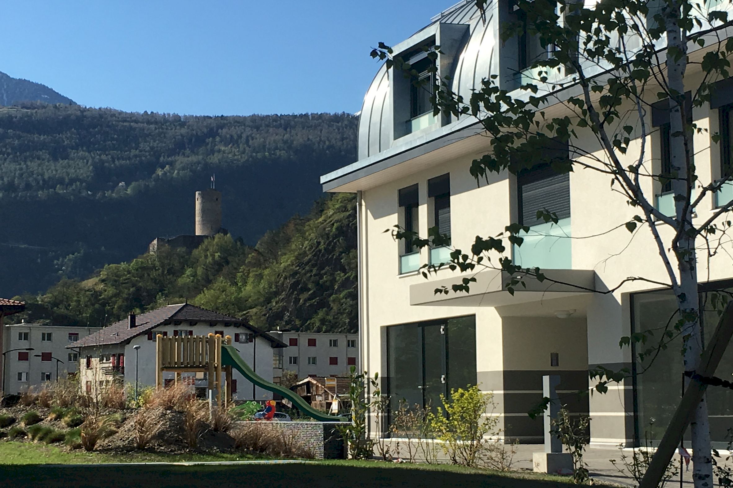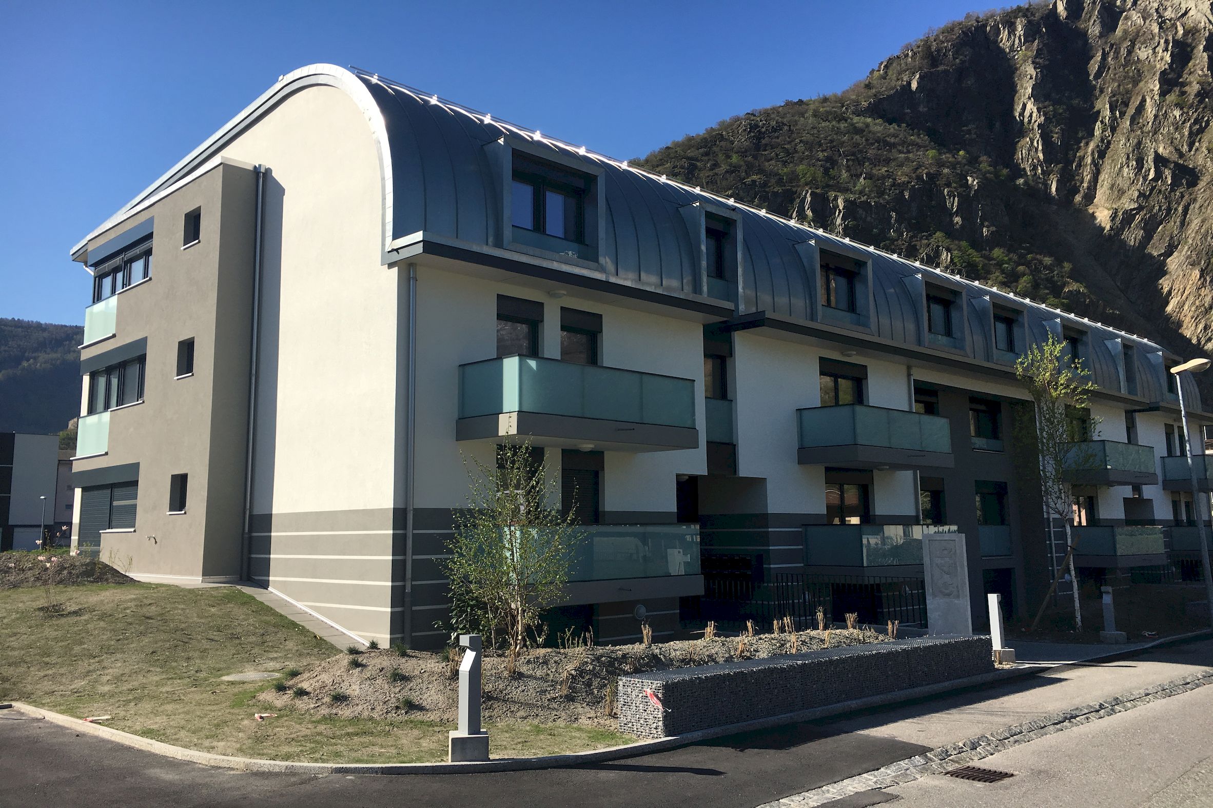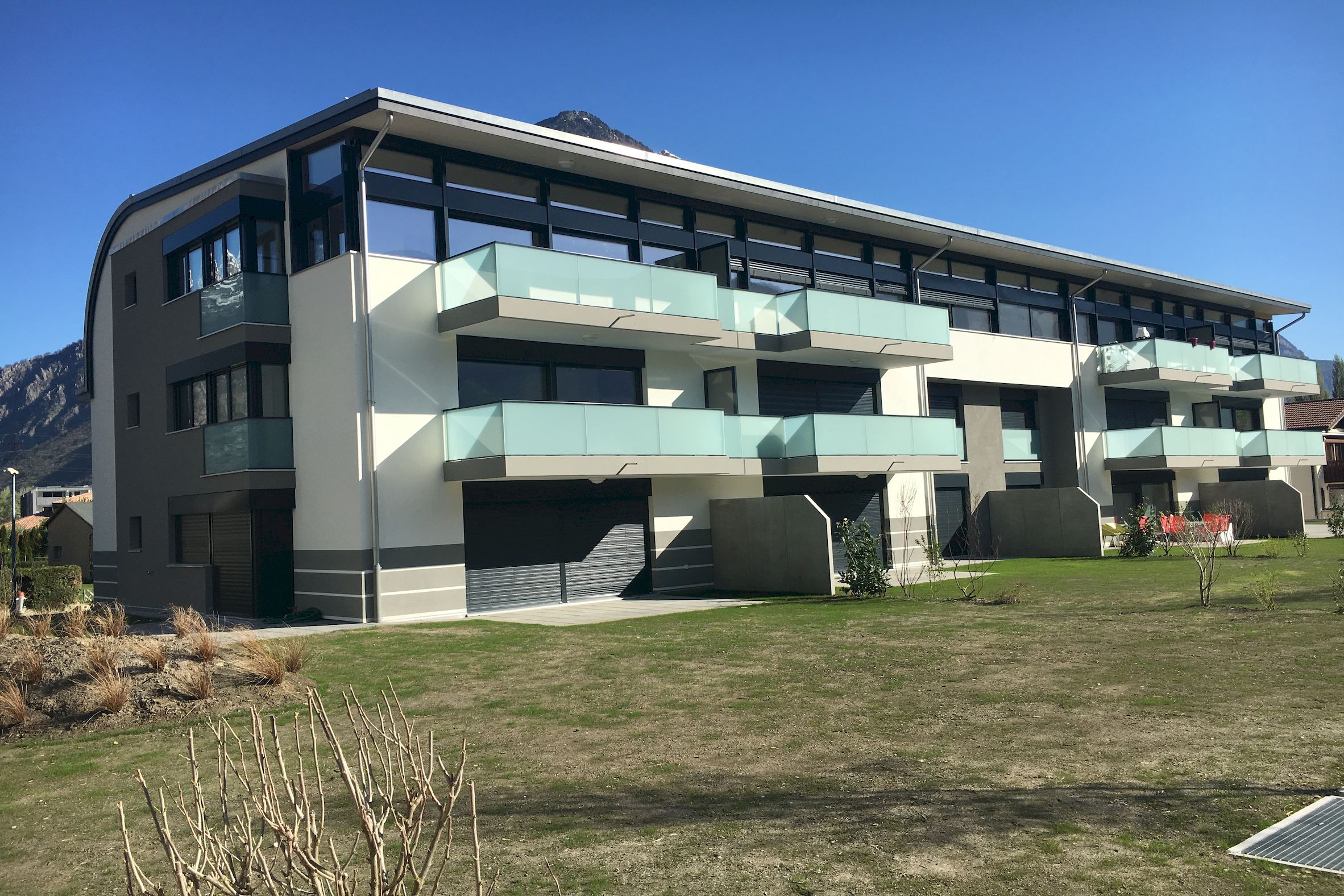 Sur une jolie parcelle de 3624 m2 située face au château de Martigny, ont été contruits 3 petits immeubles totalisant 22 logements, 2 surfaces commerciales, 4 ateliers et un grand parking souterrain.