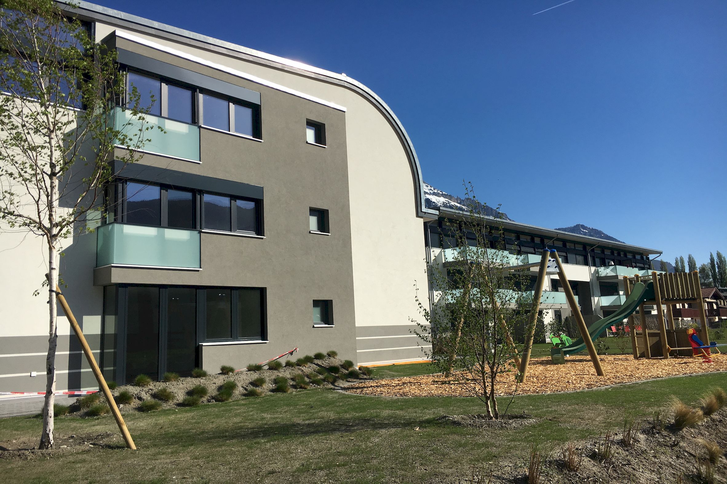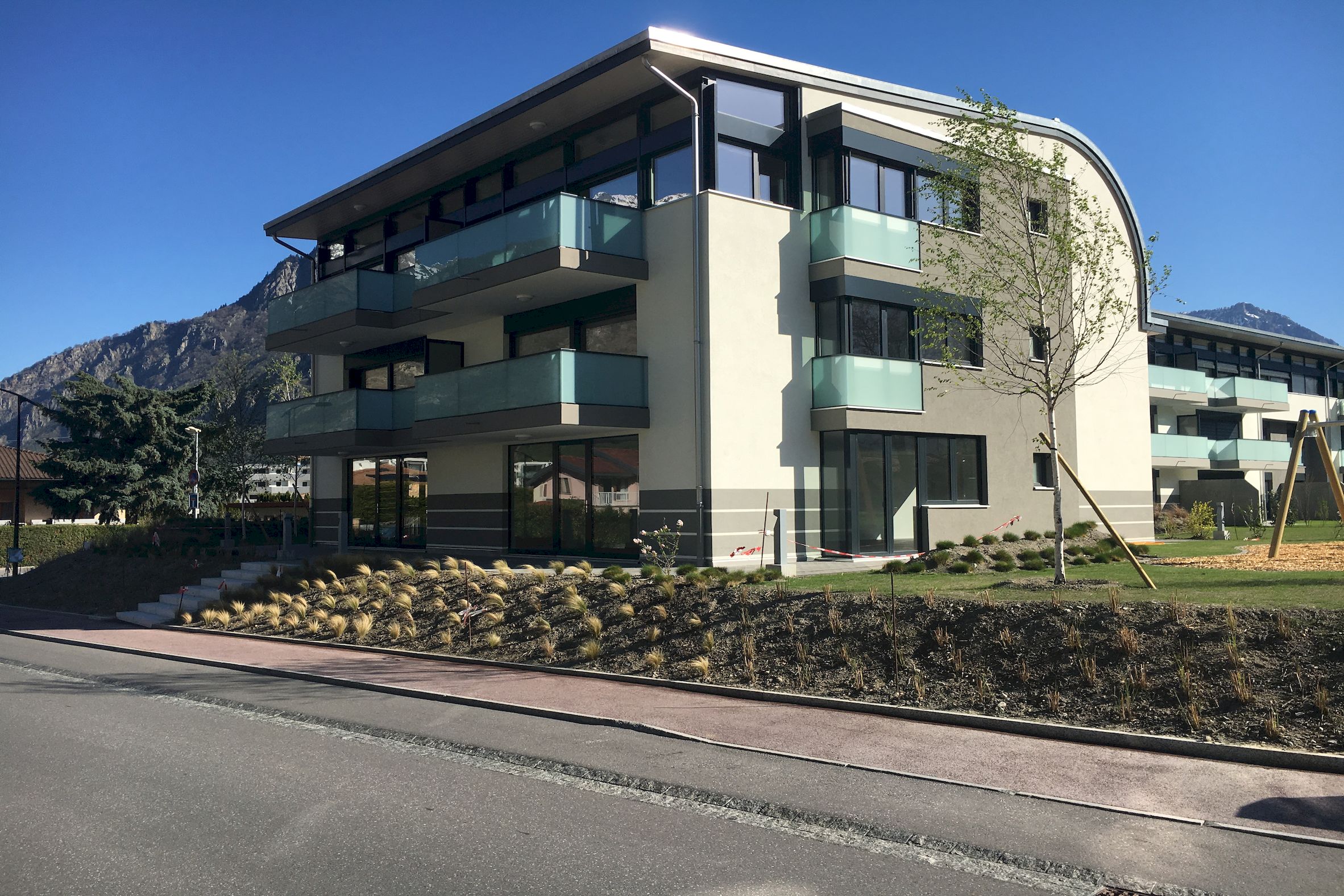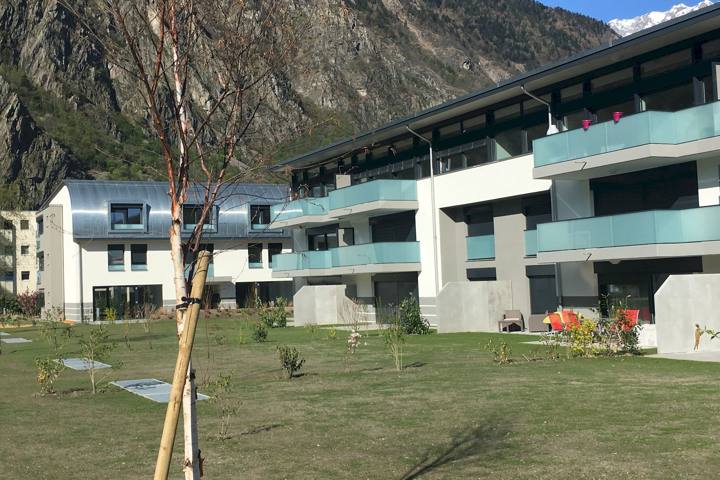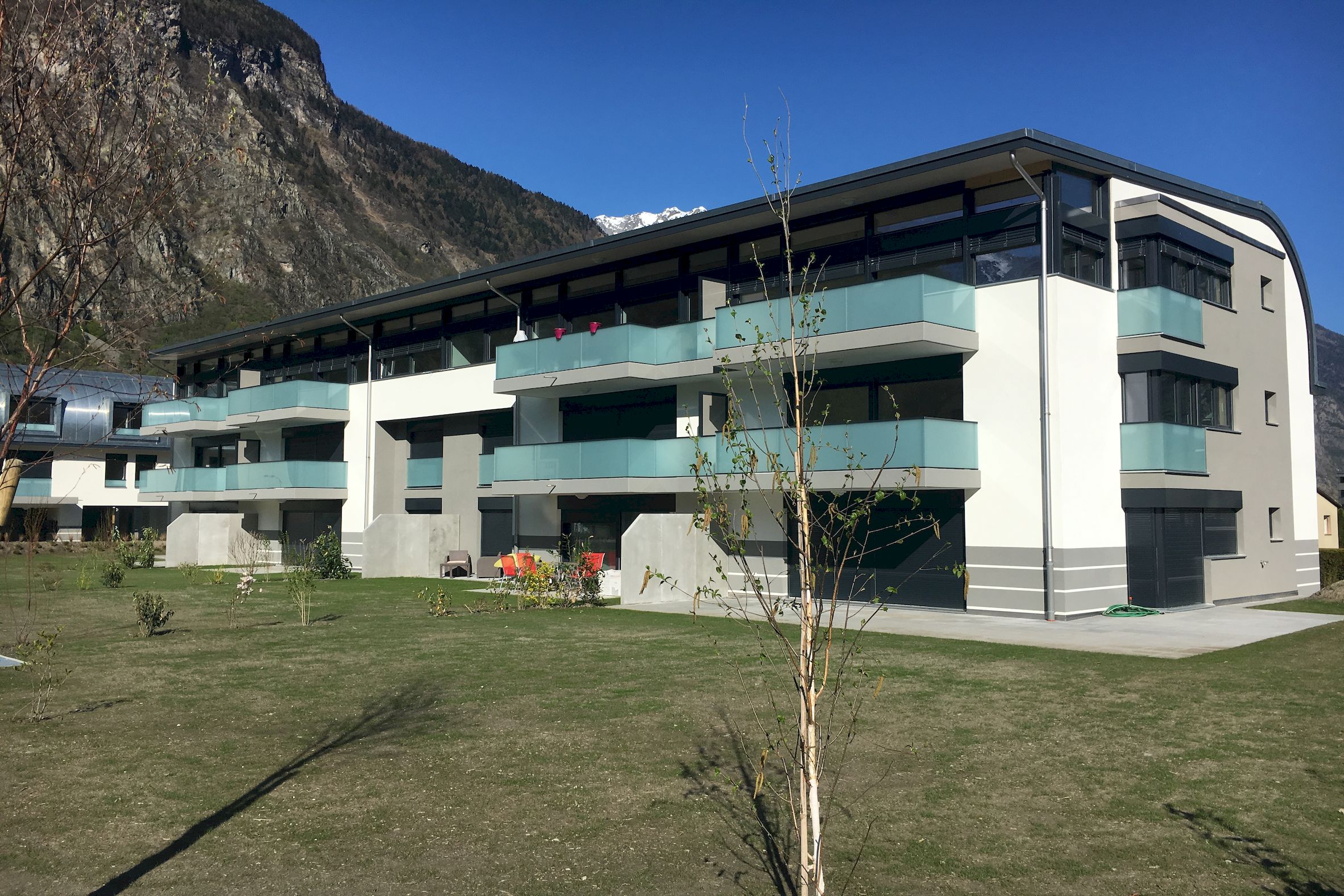 Sur une jolie parcelle de 3624 m2 située face au château de Martigny, ont été contruits 3 petits immeubles totalisant 22 logements, 2 surfaces commerciales, 4 ateliers et un grand parking souterrain.